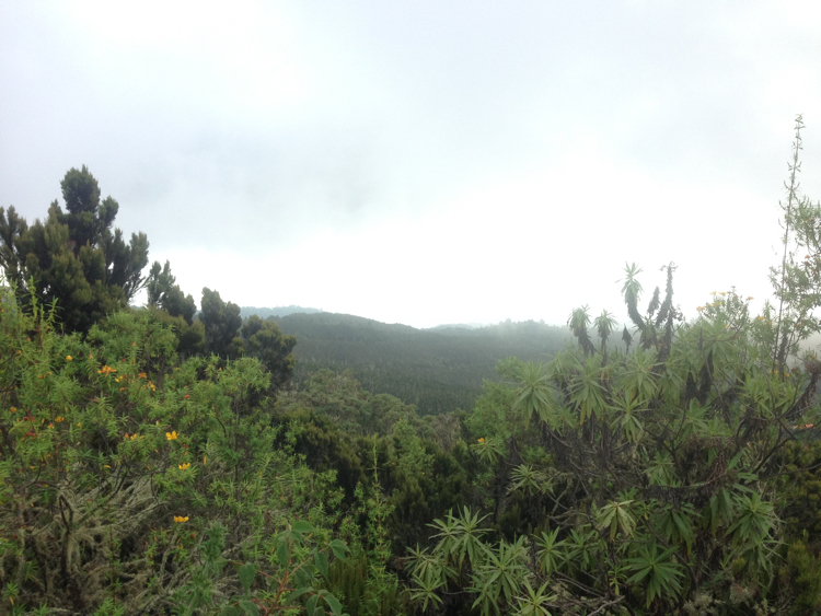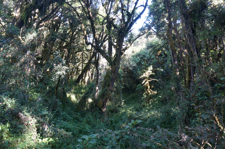 | Bild 1.1 - Blick auf den durchquerten Regenwald (Aufgenommen während eines Akklimatisierungsgangs nahe des Machame Camp; ca. 3.200 m; 16:45 Uhr). |
