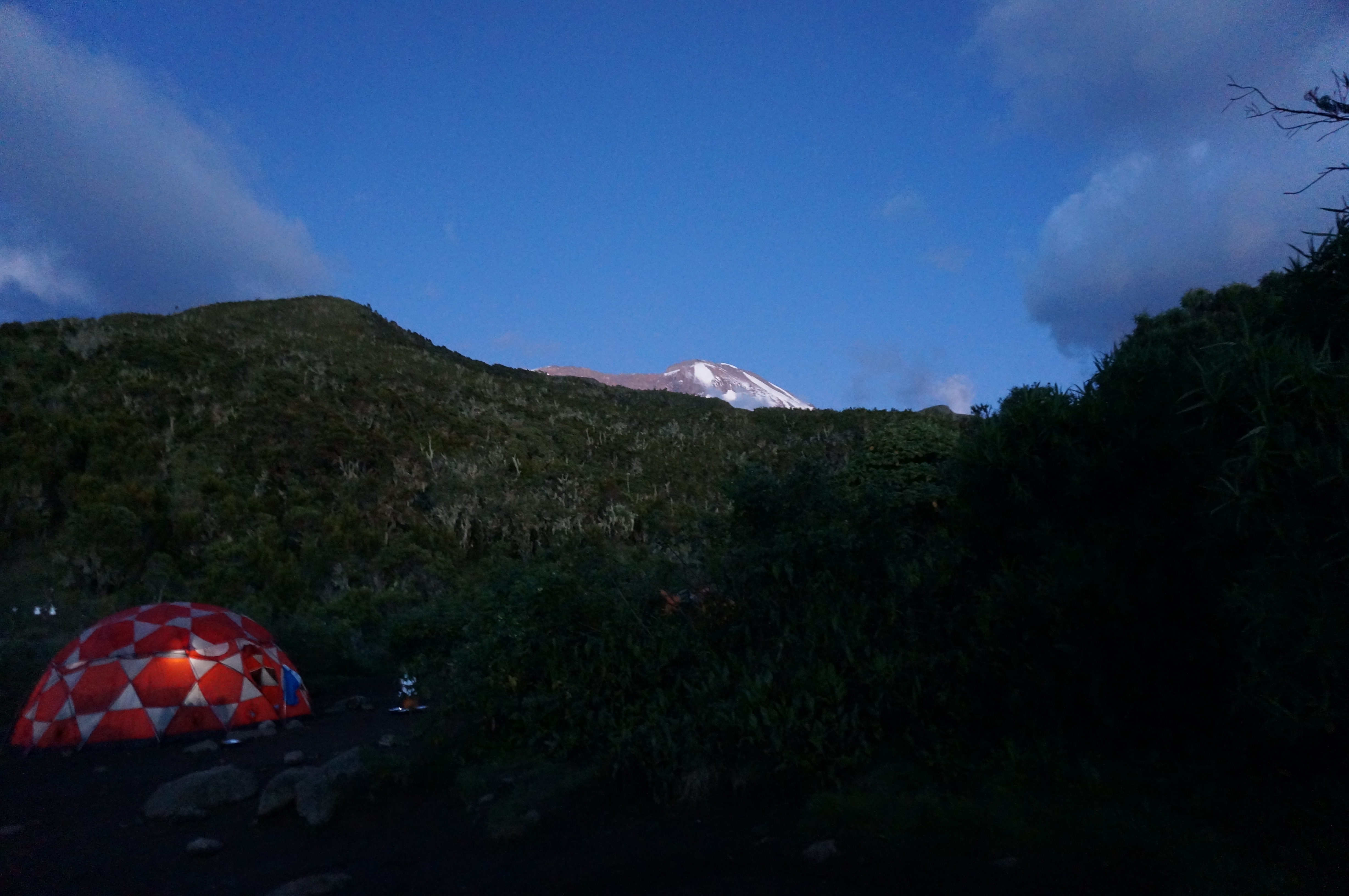 | Bild 1.2 Am Abend klärt sich der Himmel auf und es zeigt sich das erste mal der Kibo (Aufgenommen im Machame Camp; 3.020 m; 18:58) |