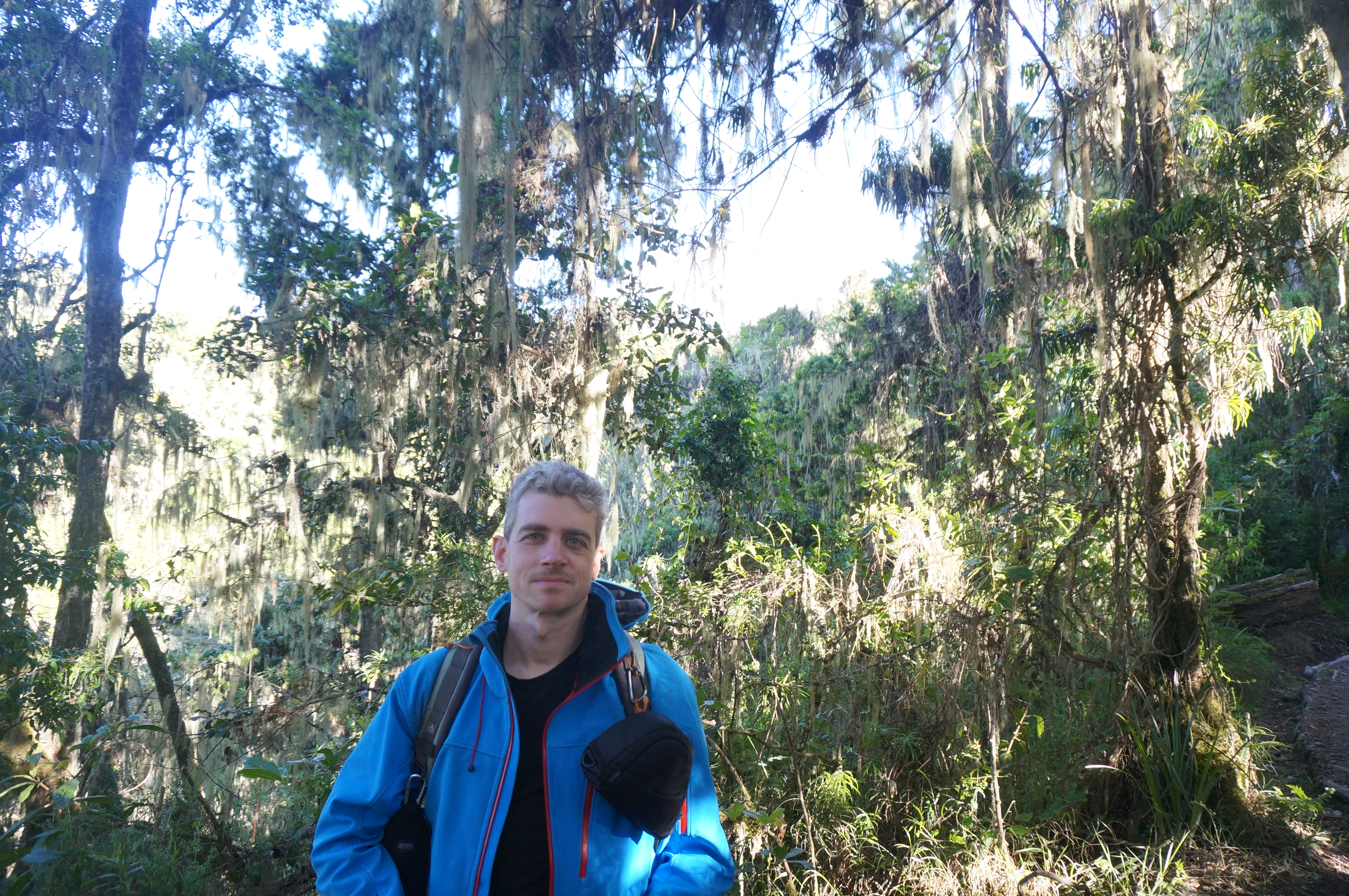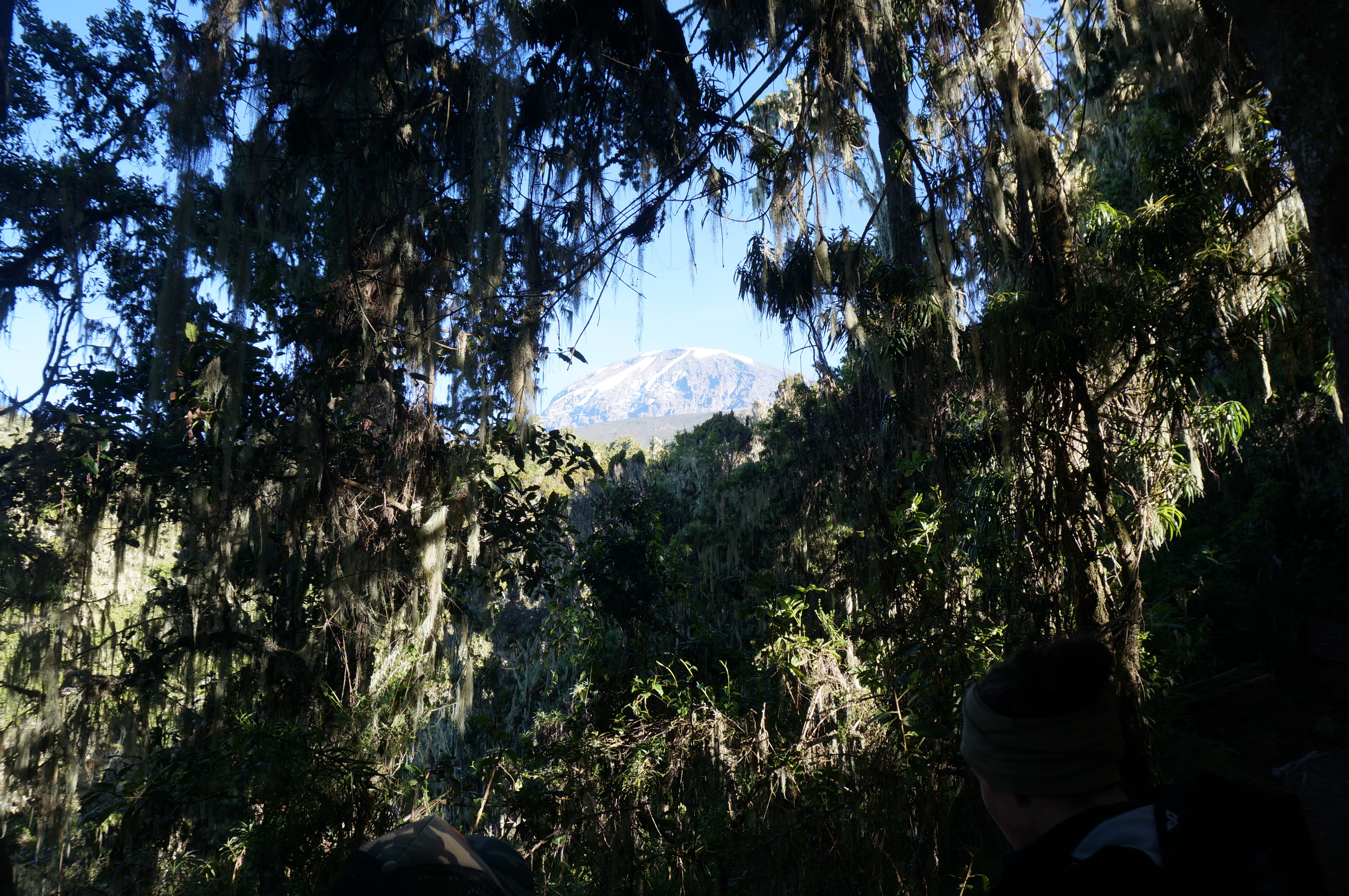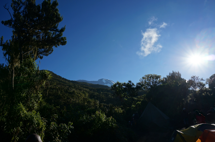 TourenberichtTag 1 (10.12.2014): Der Regenwaldgürtel Los geht es, Tag eins. Wir - das wären Nicola, Margie und Carla aus Australien, Neil und Conrad aus Südafrika, unser 25 köpfiges Expeditionsteam (Unser Bergführer Musa, seine beiden Assistenten Daniel und Emmanuel, Koch und Hilfskoch sowie die Träger) und ich - machen uns auf den Weg durch den Regenwald am Fuße des Kilimanjaromassivs. Jeder von uns konnte bis zu 15 kg persönliches Gepäck an einen Träger abgeben womit die Etappe bei leichtem Tagesgepäck heute eher einem ausgedehntem Spaziergang durch einen Regenwald ähnelt. Der Weg erinnert dabei anfänglich noch an eine Feldstraße um irgendwann in einen Pfad überzugehen. Unterwegs begegnen uns einige Affen, somit ist auch gleich etwas Unterhaltung auf dem sonst nach einigen Stunden Marsch doch eher eintönigen Weg eingebaut. Immerhin, am Abend zeigt sich das erste mal im Nachthimmel das Ziel unserer Reise: Der Kibo. |