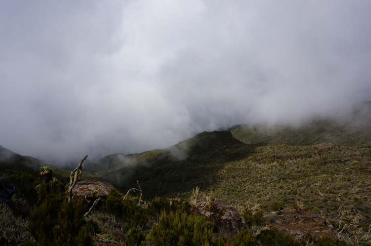 | Bild 3.7 Wolkenverhangene Gebirgswelt des Kilimanjaros bilden atemberaubende Anblicke auf 4.000 m Höhe (Aufgenommen im Barranco Camp; 3.984 m; 17:57) |