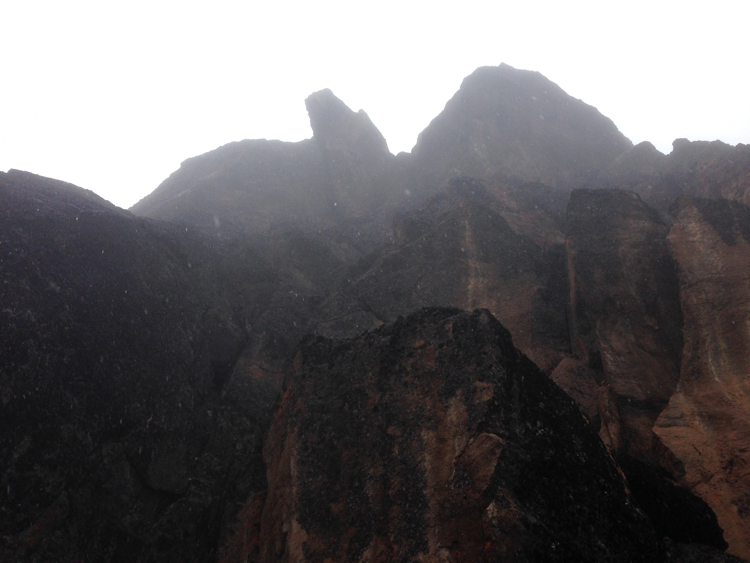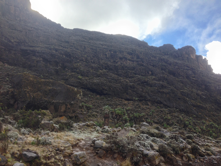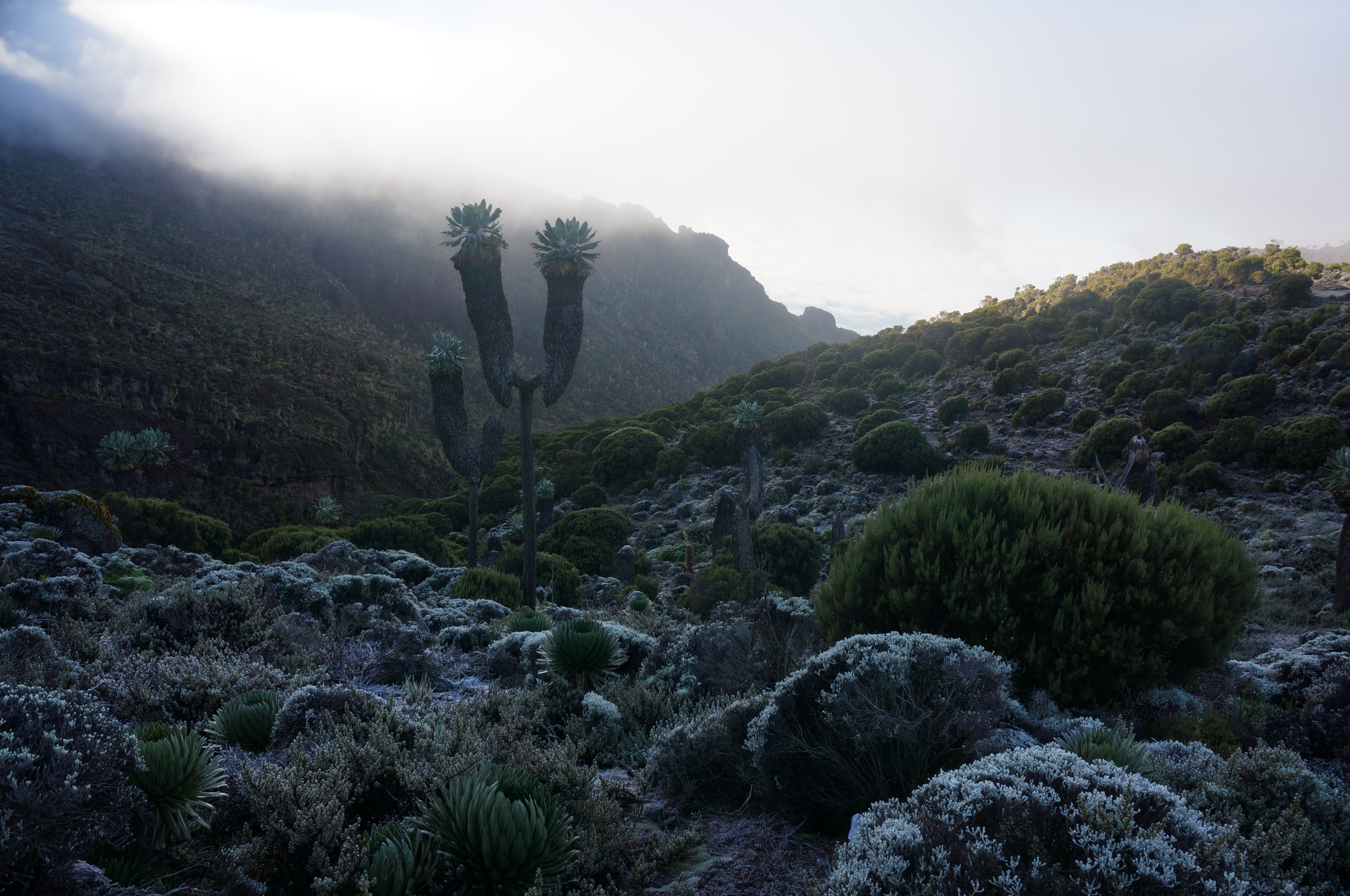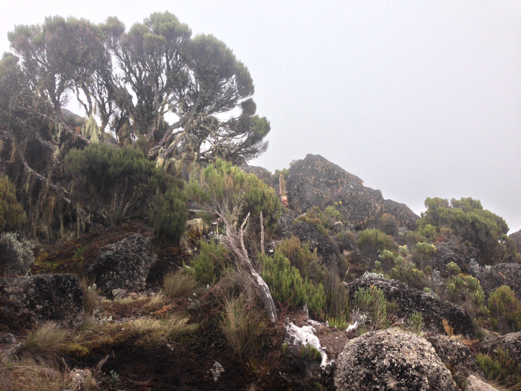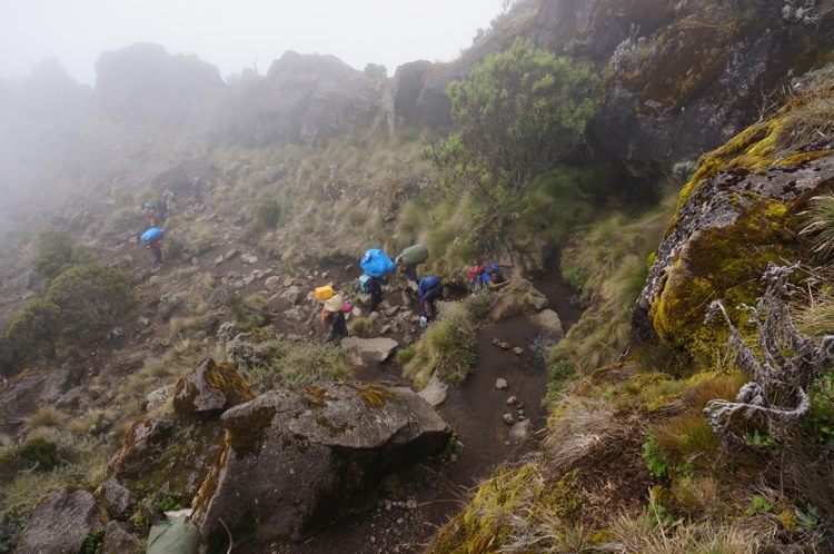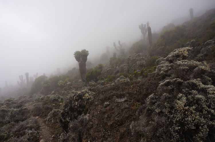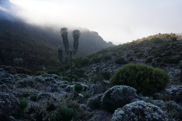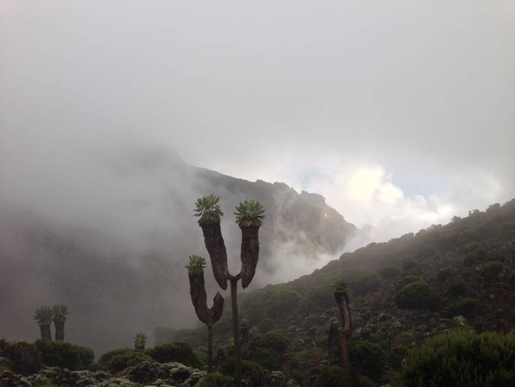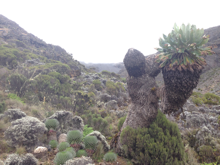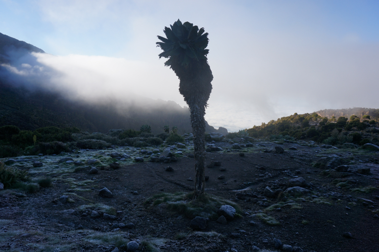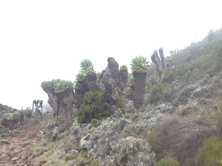 Tag 3 (12.12.2014): Der 'Lava Tower' Auch heute wandern wir wieder in eine anderen Landschaft als gestern. Das Grün weicht einer kargen Gerölllandschaft, stimmig zu den kargen Aussichten zieht auch Regen und Nebel auf. Der Höhepunkt des heutigen Tages ist das das Plateau des Lava Tower, einem rund 4.600 m hohem durch vulkanischen Aktivitäten entstandenem Gebilde, welches an einen Turm erinnert. Somit, immerhin für mich, ein neuer Höhenrekord der bislang bei 4.167 m lag (der Jebel Toubkal in Atlas Gebirge). Trotz Regen kann ich meinem Spieltrieb nicht widerstehen und klettere einige Minuten bis an den Fuß der aufsteigenden Felswand während meine Mitstreiter am Fuß des Plateaus zurückbleiben, ihnen ist es bei der Nässe nicht auch noch nach klettern Der Lava Tower gilt als wichtige Stelle für eine erfolgreichen Höhenakklimatisierung die hohe Tagesetappen bei niedriger Schlafhöhe empfiehlt. Unser Bergführer hatte uns bei dieser Höhe vor den Symptomen der Höhenkrankheit gewarnt, dennoch haben wir alle Glück und bleiben von diesen verschont. Bislang verläuft mit oder ohne Diamox die Anpassung sehr gut. Beim Abstieg vom Lava Tower begegnen sie uns nun das erste mal: Riesensenezien, große wuchtige und für mich so fremdartige Pflanzen dass sie aus einer Fantasiewelt zu entstammen scheinen - und das bei einer Höhe von über 4.000 m wo in den Alpen schon knapp über 2.000 m Höhe nur noch kleine Büsche und Sträucher wachsen. Vegetations- und Klimazonen wechseln sich somit weiterhin täglich ab, auch oder gerade das macht den Kilimanjaro so reizvoll. |