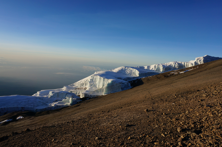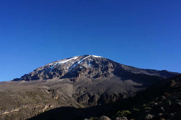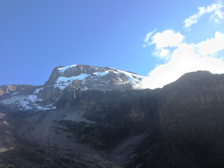 | Bild 4.3 Im Norden zeigt sich der Kibo, rechts daneben erstreckt sich die Barranco Felswand die es heute zu überwinden gilt. (Aufgenommen im Barranco Camp; 3.984 m; 08:08 Uhr) |