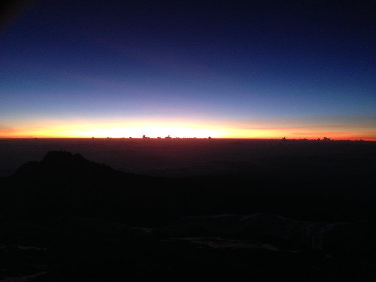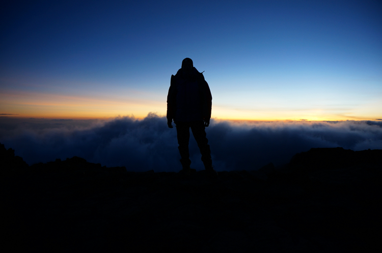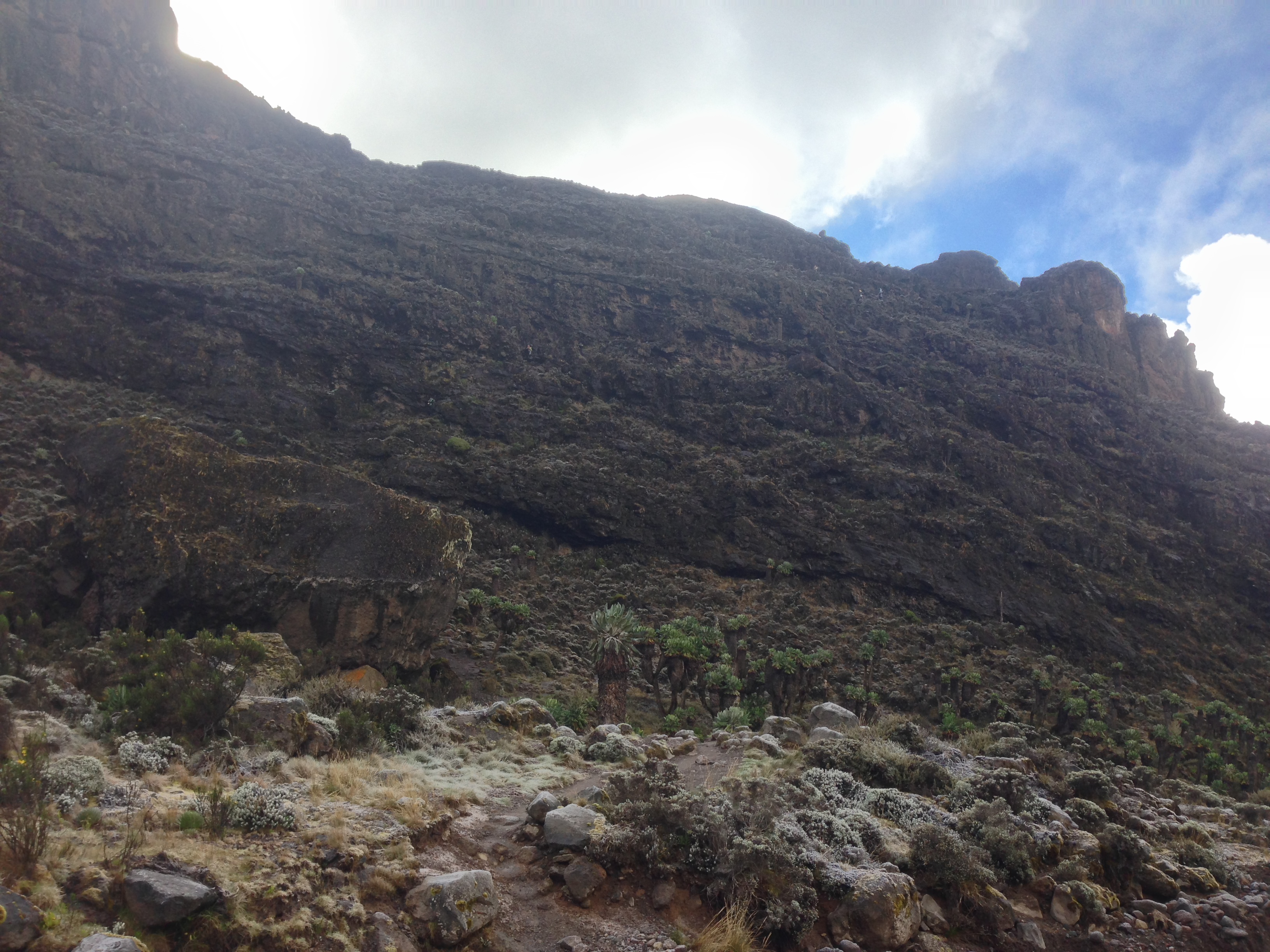 Tag 4 (13.12.2014): Breach Wall 'Auf und ab' ist das heutige Motto. Zwar werden wir am Ende des Tages die gleiche Höhe haben wie am Start, jedoch müssen wir hierfür mehrfach auf und absteigen um dann am Ende des Tages noch einen langen steilen Aufstieg zu überwinden um zum Camp zu gelangen. Zunächst steht jedoch einer meiner Höhepunkte an: Die Breach Wall, eine rund 300 m hohe Wand die fast senkrecht vor uns aufzuragen scheint. Von unten kaum zu glauben führt ein Weg mit einfachen Kletterstellen bis zu ihrer Kante. So man den Normalweg geht - ich weiche immer mal wieder ab um erklettere anspruchsvollere Stellen und kürze so auch den Weg ab. Am Abend der nächste Höhepunkt: In der Dunkelheit blickt man bei vollständiger Stille nach Moshi, der Großstadt am Fuß des Kilimanjaros, die den Startpunkt unserer Reise darstellte. Ein Blick von oben auf tausend kleine Lichter, wie der Blick aus einem überfliegendem Flugzeug bei Nacht. Ich könnte scheinbar ewig nach unten schauen und die Ruhe hier oben in vier Kilometer Höhe genießen. |