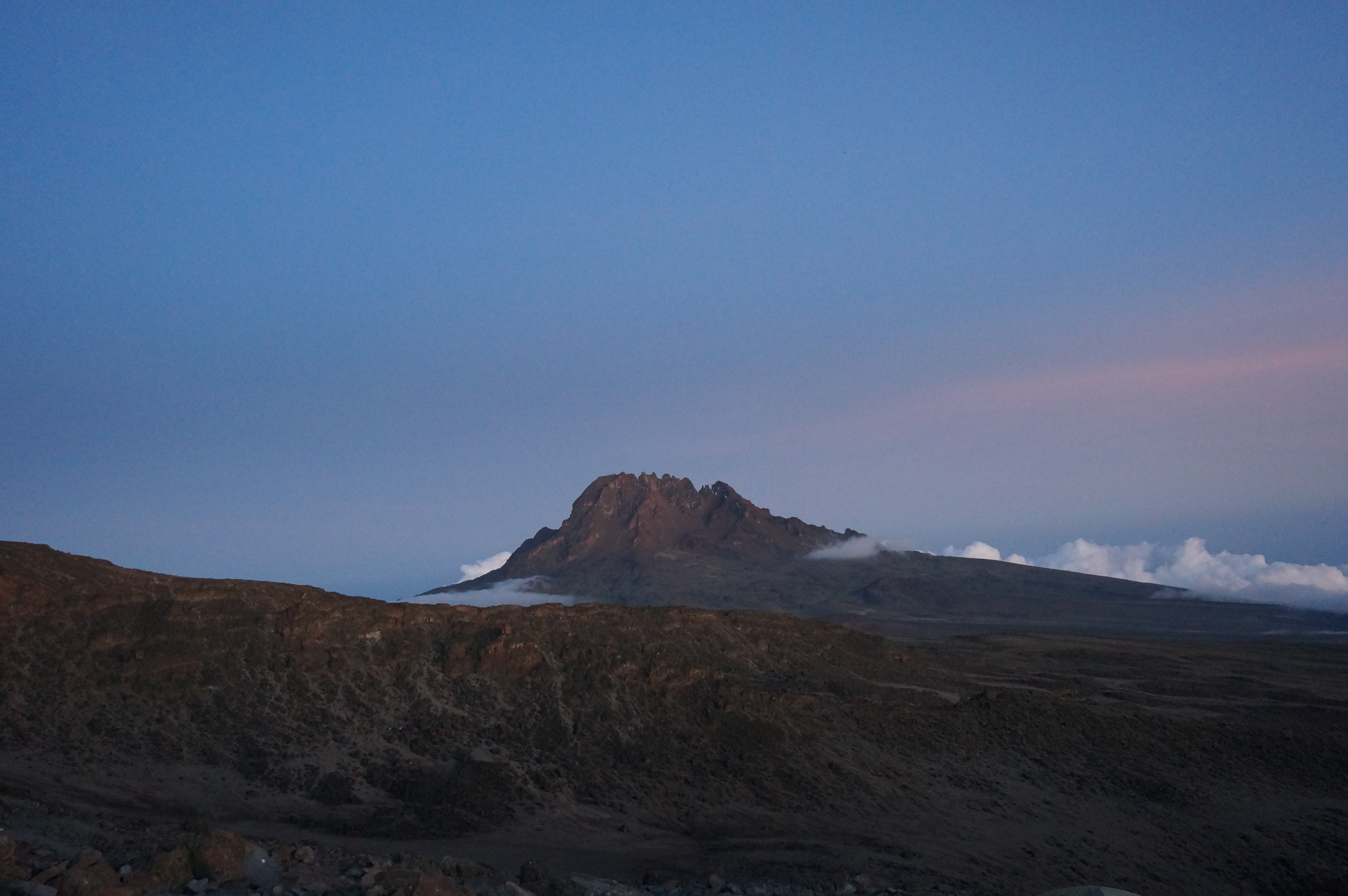 | Bild 3.1 Der Kibo am Morgen, die frühen Wolken sind kein gutes Wetterzeichen für den heutigen Tag (Aufgenommen im Shira Camp; 3.847 m; 06:51 Uhr) |