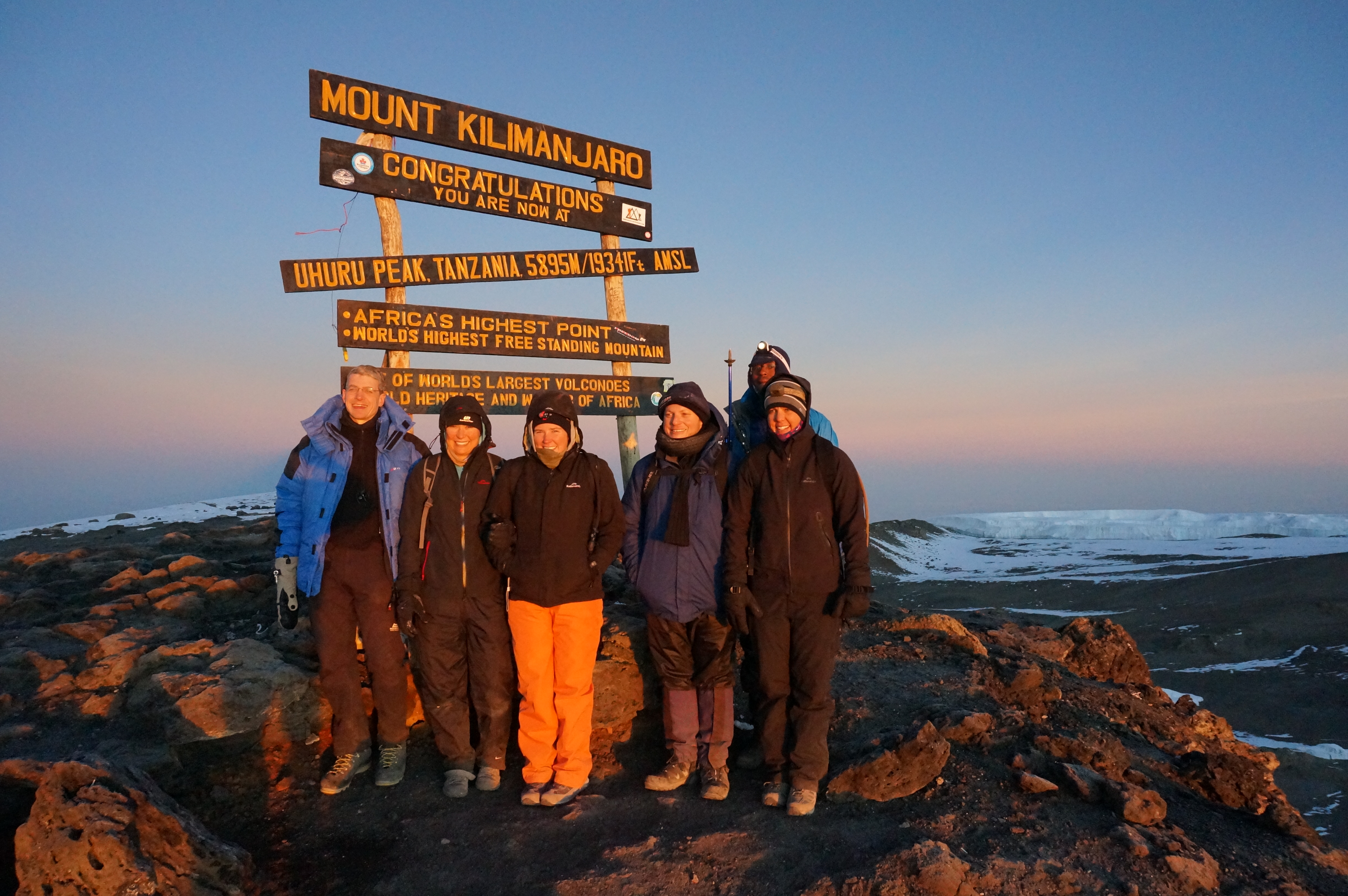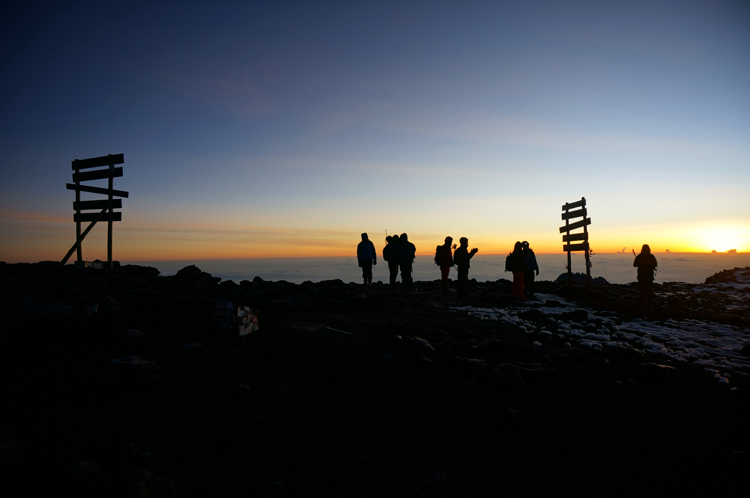Tag 6 (15.12.2014): Gipfeltag Nach einer viel zu kurzen und unruhigen Nacht stehen wir gegen 23:30 Uhr auf. Als ich auf aus dem Zelt klettere sehe ich schon die ersten kleinen Lichter der Stirnlampen anderer Gipfelaspiranten die sich langsam dem Berg hochbewegen. Die ersten Gruppen sind deutlich vor uns aufgebrochen. Zum Frühstück gibt es nur noch Popcorn um möglichst einem Erbrechen durch die Höhenkrankheit vorzubeugen. Gegen 00:30 ist es soweit, als einer der letzten Gruppen starten wird in dieser Nacht zu neunt (unsere drei Bergführer und wir, die sechs zahlenden Gäste) den Gipfelsturm. Die nächsten Stunden nutze ich intensiv mein Smartphone um Musik und Podcasts zu hören. Zu eintönig ist der Aufstieg im Schein der Stirnlampen. Unser Tempo ist schnell, nach und nach werden wir alle vor uns gestarteten Gruppen einholen. Dennoch kommt mir unser Tempo langsam vor, schneller könnte ich in der Höher aber auch nicht aufsteigen. Unterwegs beginnen unsere Bergführer plötzlich im Chor Lieder zu singen (im Übrigen erstaunlich gut). Kaum zu glauben, zu einem Zeitpunkt zu dem ich hastig atmend versuche irgendwie meine Lungen mit Luft zu füllen erhalten wir eine erstaunlich gute Vorstellung tansanianischen Gesangeskunst vorgeführt. Schon bald wird jedoch auch meine Schnappatmung nicht mehr den Sauerstoffmangel kompensieren können. Immer öfters bleibe ich stehen um mit drei, vier schnellen und tiefen Atemzügen genug Luft zu bekommen um so wieder mit Schnappatmung die nächsten Schritte gehen zu können um bald aufgrund Luftmangels erneut stehen bleiben zu müssen. Kurz vor Sonnenaufgang erreichen wir schließlich den Kraterrand, zu diesem Zeitpunkt haben wir bereits alle vor uns gestarteten Gruppen weit hinter uns gelassen. Im Schein der aufgehenden Sonne ist es nach einem fünfeinhalb stündigen Marsch um 6:00 Uhr soweit: Wir stehen alle gemeinsam - wie von unserem Bergführer Musa prophezeit - auf dem Uhuru Peak, dem höchsten Punkt Afrikas auf dem höchsten freistehendem Berg der Welt. Wir bleiben etwa 20 Minuten bis unsere Bergführer beginnen zum Rückmarsch auffordern, zu hoch ist die Gefahr der Höhenkrankheit hier oben. Nur mühsam kann ich bei -15 Grad mit meinen steifen Finger meine Handschuhe wieder anziehen die ich zum Fotografieren ausgezogen hatte. So hatten wir doch viel Glück mit dem Wetter. Der wolkenlose Himmel bot einen fantastischen Ausblick. Auch wehte kaum Wind auf dem Gipfel wodurch die gefühlte Kälte nicht noch kälter als die reale Temperatur wirkte. So treten wir widerwillig den Marsch nach unten an, zu großartig sind die Momente hier oben auf dem Gipfel der uns immer noch alleine gehört. Erst als wir den Marsch nach unten antreten begegnet uns der erste einzelne Bergsteiger der sich von seine Gruppen gelöst hatte und nun selbst bald den Gipfel erreichen wird - eine halbe Stunde nachdem wir diesen erreichten. Die große Masse der Aspiranten hat aber auch er hinter sich gelassen. Bis zum Gipfel hatte ich keinerlei Anzeichen der Höhenkrankheit, so langsam fragte ich mich, ob die ganzen warnenden Berichte in denen die Gipfelaspiranten von schweren Auswüchsen dieser geplagt werden, nicht doch etwas übertrieben waren. Ich weiß nicht mehr wann es passiert ist, jedoch irgendwann merke ich, dass etwas nicht mehr mit mir stimmt - so ganz und gar nicht mit mir stimmt. Träume ich? Bin ich wirklich auf dem Kilimanjaro? Was passiert hier? Die Grenzen zwischen Realität und Traum verschwinden immer mehr, mein Kurzzeitgedächtnis setzt aus. Ich weiß, dass eben etwas passierte, ich etwas zu jemanden sagte, irgendetwas tat - die Details dessen verschwinden jedoch sofort, wie ein Traum nachdem man aufwachte. Ich habe das Gefühl mein Gehirn ist in Watte eingepackt, irgendwo bin ich durch eine dicke Wand von der Realität abgekoppelt. Und es wird nicht besser, langsam verliere ich jedes Zeitgefühl. War da etwas? War es eben oder vor eine halbe Stunde? War es wirklich oder doch nur eine Einbildung, eine Vorstellung? Mein Gedächtnis arbeitet gefühlt nur noch mit der halben Leistung. Ich habe das Gefühl zu torkeln, habe das Gefühl nicht mehr gerade gehen zu können, ständig das Gefühl hinfallen zu müssen, das Gefühl mich nur noch durch Hilfe meiner Stöcke vorwärtsbewegen zu können. Die Höhenkrankheit zeigt sich auf viele verschiedene Arten. Die einen haben Kopfschmerzen, die anderen übergeben sich, und bei mir war es das Gefühl des Realitätsverlustes. Am ehesten noch vergleichbar mit einem starken Alkeholrausch, wobei der Zustand hierdurch nicht wirklich beschrieben wird den ich dort oben erlebte. An den Abstieg selber habe ich kaum noch Erinnerungen, immerhin lande ich irgendwann acht Stunden nach unserem Aufbruch wieder in meinem Zelt (Was ich aber nur noch durch die Zeitstempel der von mir noch gemachten Fotos weis). Vielleicht war es der schnelle Aufstieg der hier seinen Tribut forderte. Nach nur eine viel zu kurzen Stunde Schlaf muss ich wieder aufstehen, mein Zeug packen. Wir frühstücken kurz, nun sind wir alle gezeichnet auf die eine oder andere Weise durch die vorangegangenen Anstrengungen, das Glücksgefühl über den Erfolg werden wir erst morgen erleben. Meine Symptome werden noch die nächsten Stunden anhalten. Traum und Realitätsgefühl werden sich nur langsam wieder trennen. Irgendwie steigen wir heute nun noch weitere 1.600 m ab, beißen die Zähne zusammen bis wir am Nachmittag auf rund 3.000 m unser Camp erreichen, nur einige Stunden zuvor waren wir auf fast 6.000 m. |