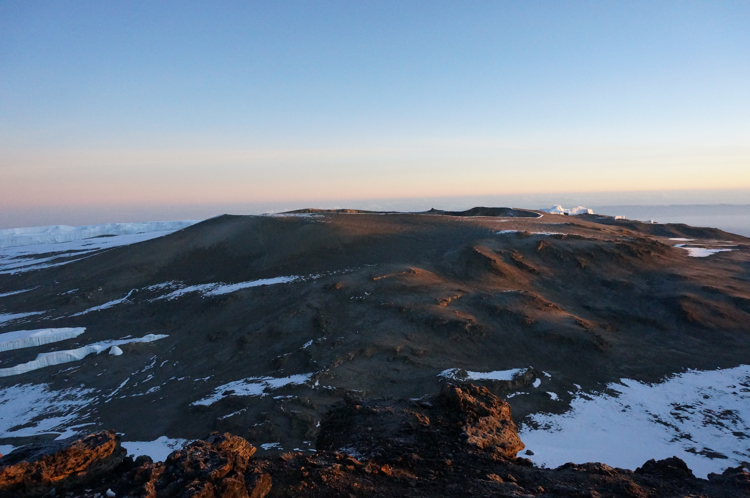 | Bild 6.6 Blick auf den inneren Krater des Kibos. Auch heute ist der Kibo noch aktiv, der letzte Ausbruch liegt aber mindestens 1.700 Jahre zurück. (Aufgenommen am Uhuru Peak; 5.895 m; 06:14 Uhr) |